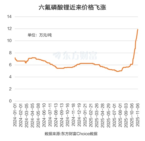 电解液价格的增长也带动了核心材料六氟磷酸锂的价格上涨。东方财富Choice数据显示,六氟磷酸锂11月6日的报价为11.9万元/吨,这较今年7月中下旬的4.93万元/吨大涨141.38%。