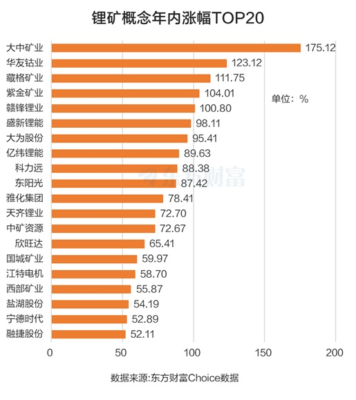 今年以来,锂矿概念震荡走强,截至11月7日累计涨幅为61.77%。板块中大中矿业、华友钴业、藏格矿业、紫金矿业、赣锋锂业纷纷翻倍。